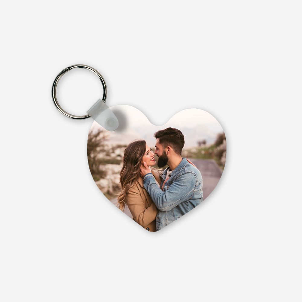 Com formato de coração e personalização total (100%) em ambas as faces, este porta-chaves transforma qualquer foto ou frase num presente romântico e inesquecível.
